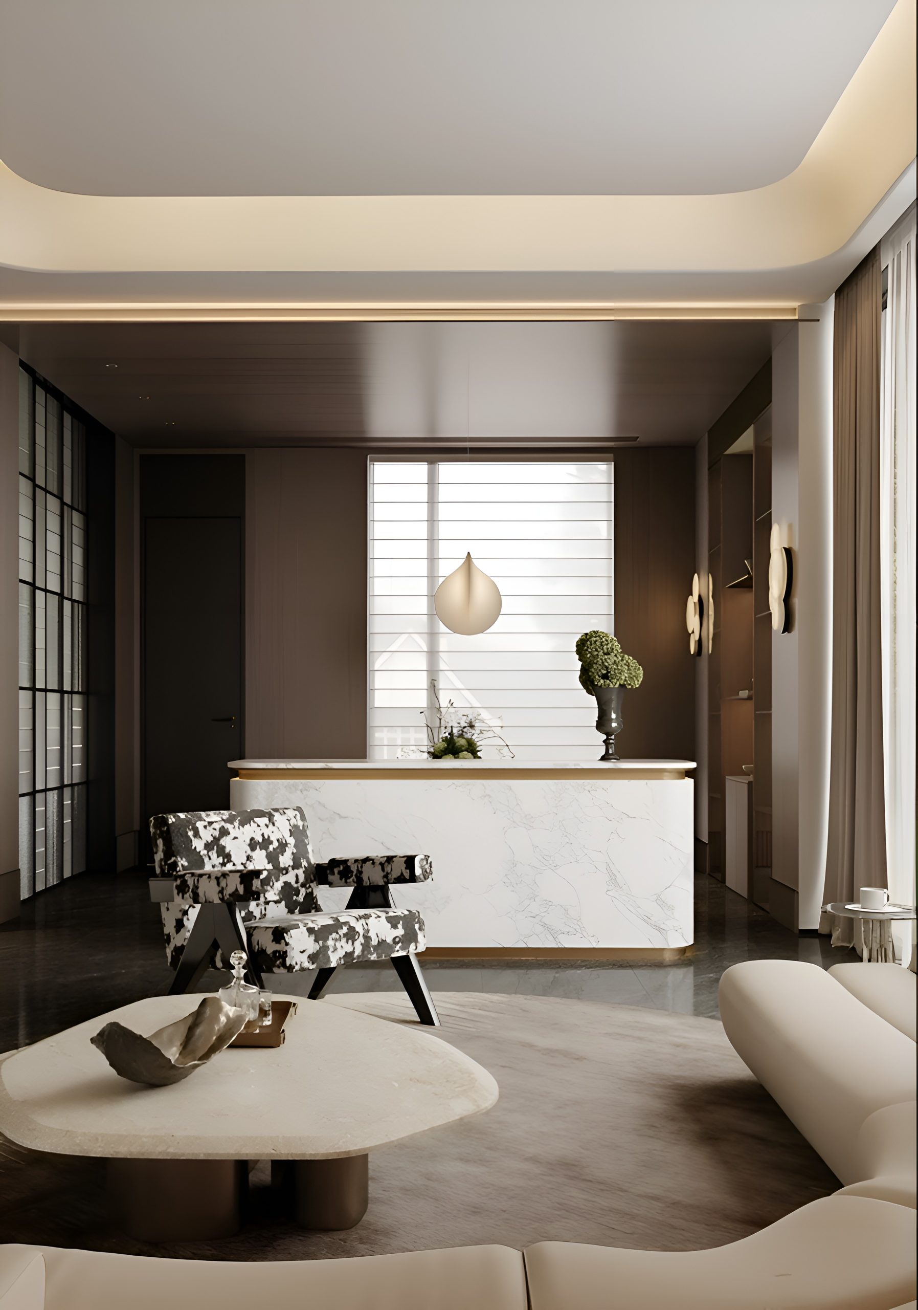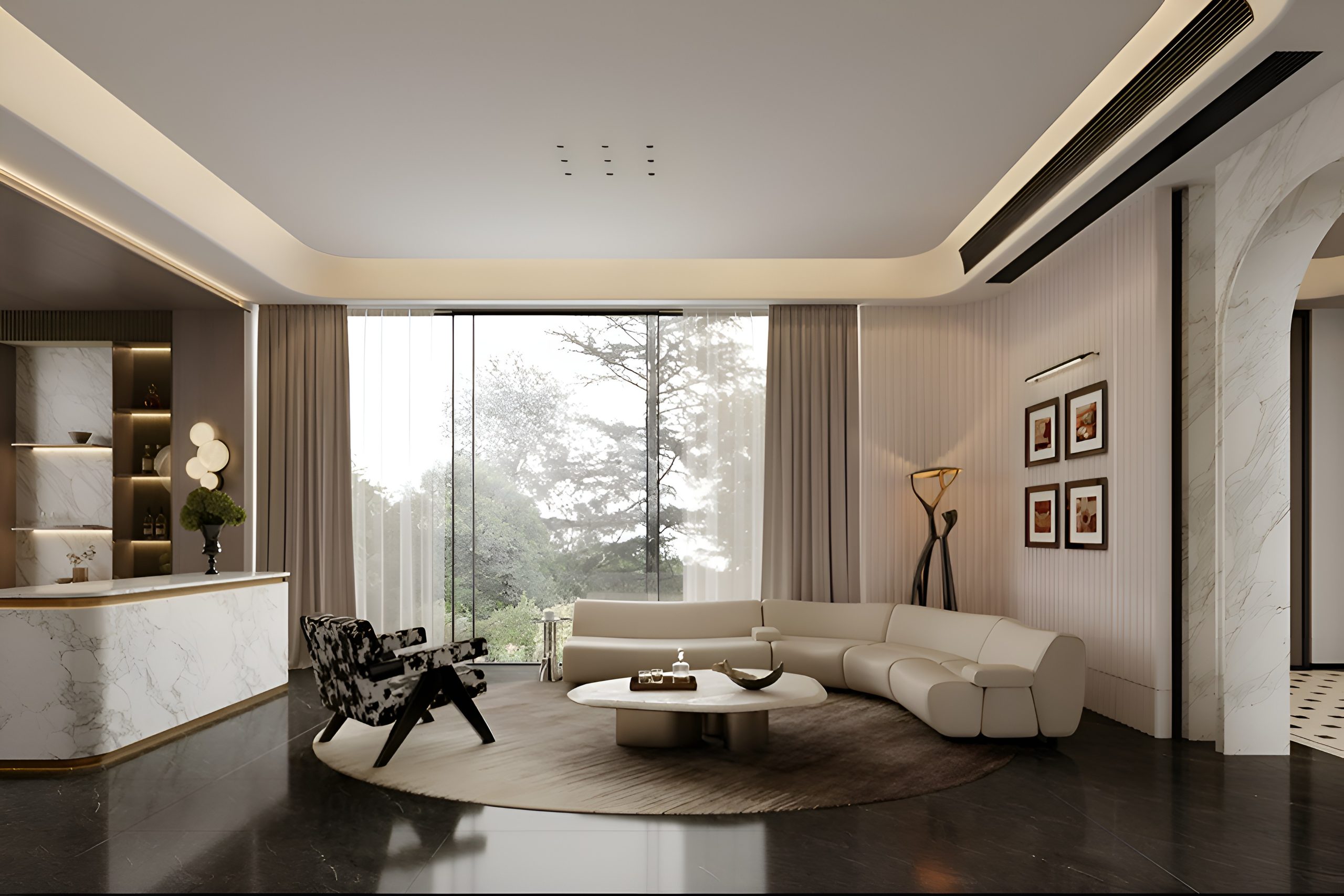 Интерьер построен на гармонии минимализма и комфорта. В основе концепции — натуральные материалы и мягкая палитра оттенков, подчёркнутые акцентами из камня и тёмного дерева. Большие панорамные окна усиливают ощущение простора и наполняют помещения естественным светом.