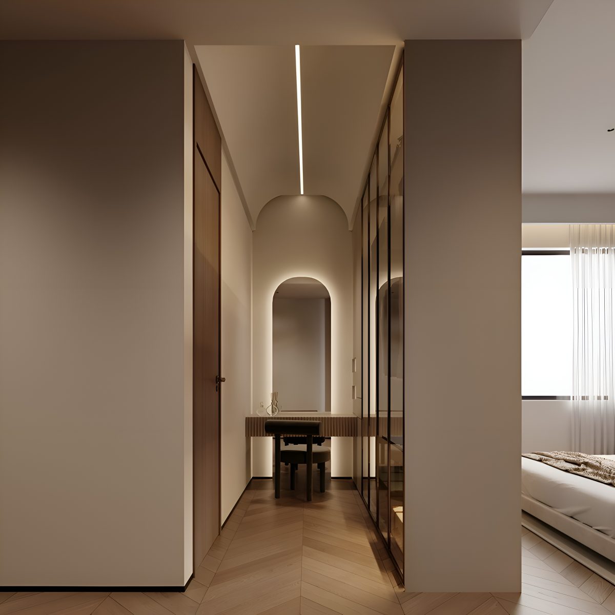 Гостиная объединяет функциональность и эстетику: изысканная мебель, встроенные системы хранения с подсветкой и уютные зоны для отдыха и общения. Пространство создано так, чтобы быть универсальным — подходящим и для спокойного уединения, и для приёма гостей.