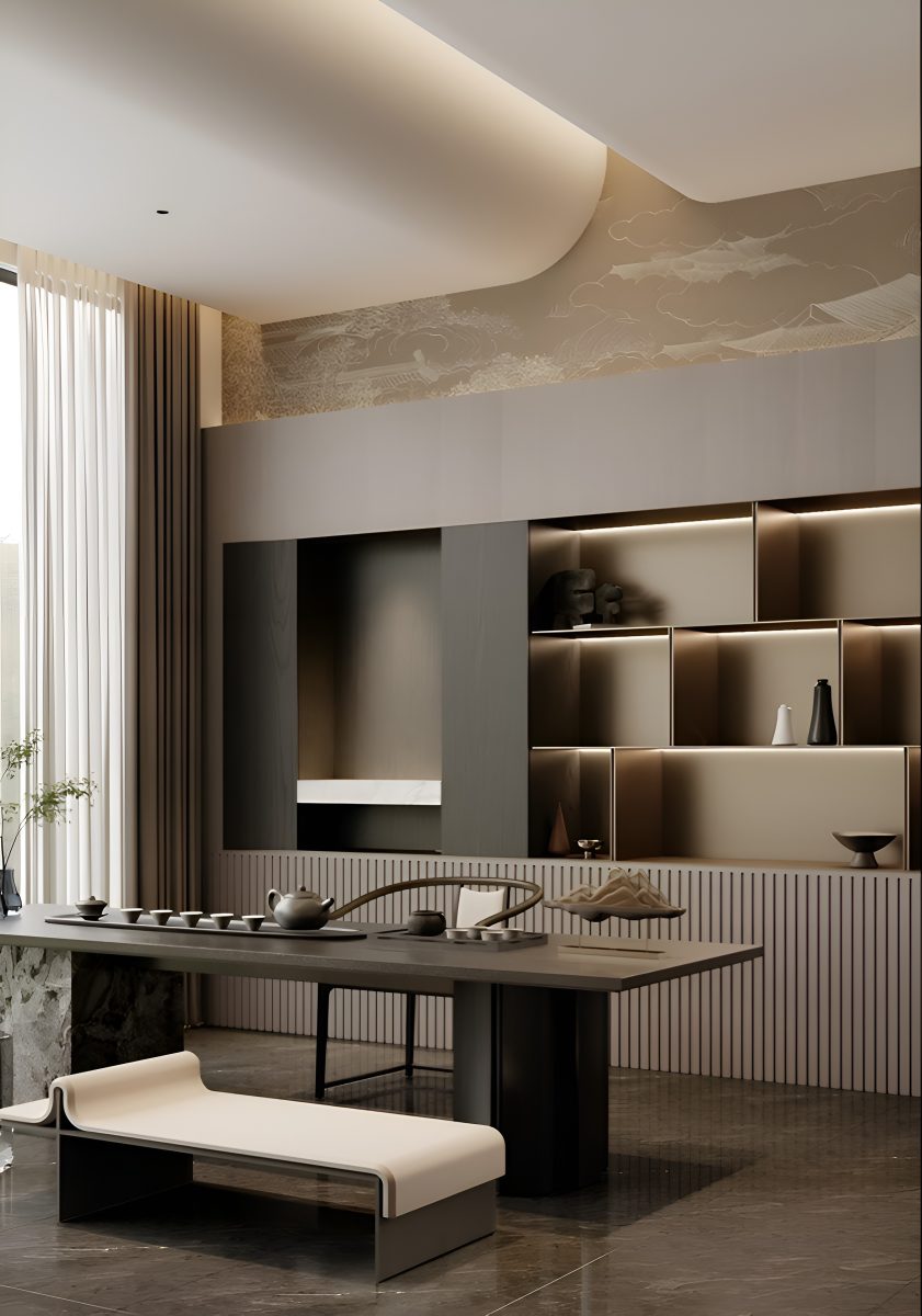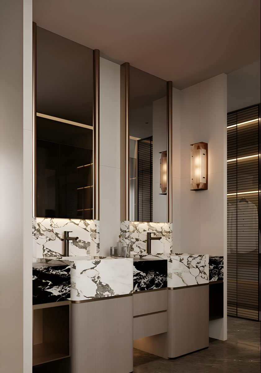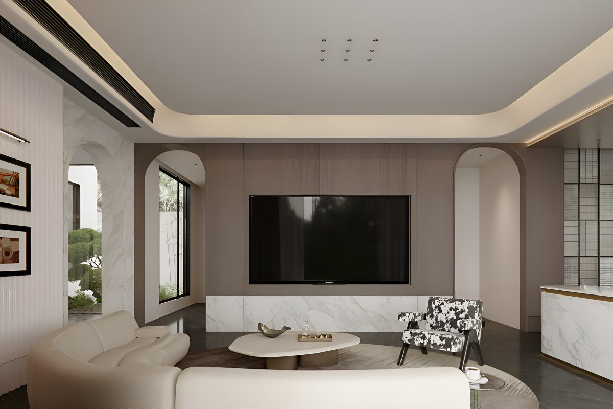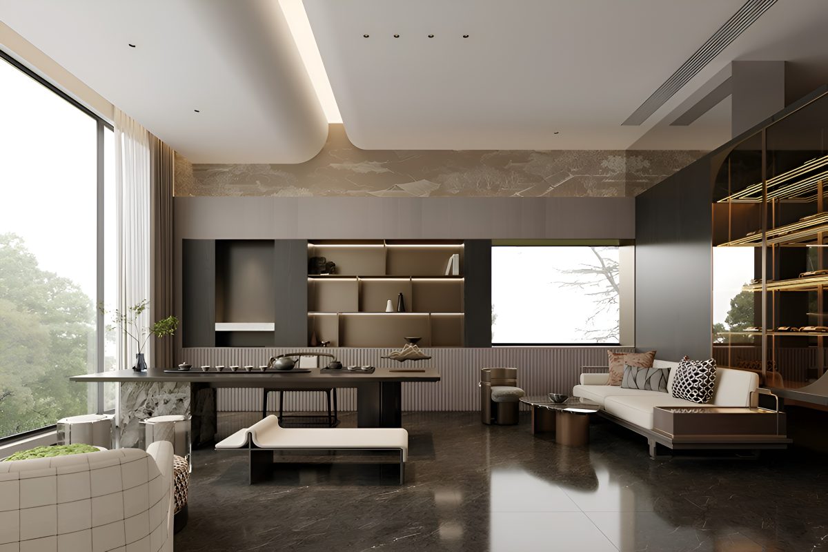 Интерьер построен на гармонии минимализма и комфорта. В основе концепции — натуральные материалы и мягкая палитра оттенков, подчёркнутые акцентами из камня и тёмного дерева. Большие панорамные окна усиливают ощущение простора и наполняют помещения естественным светом.