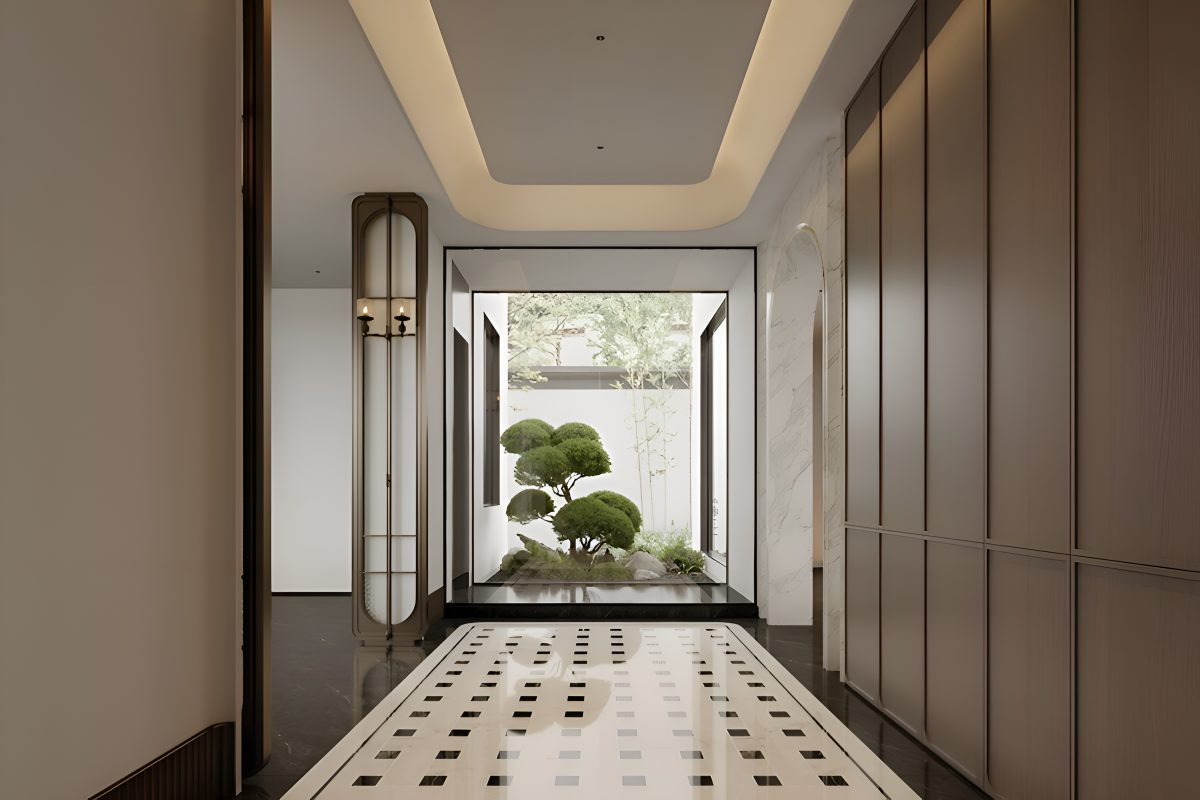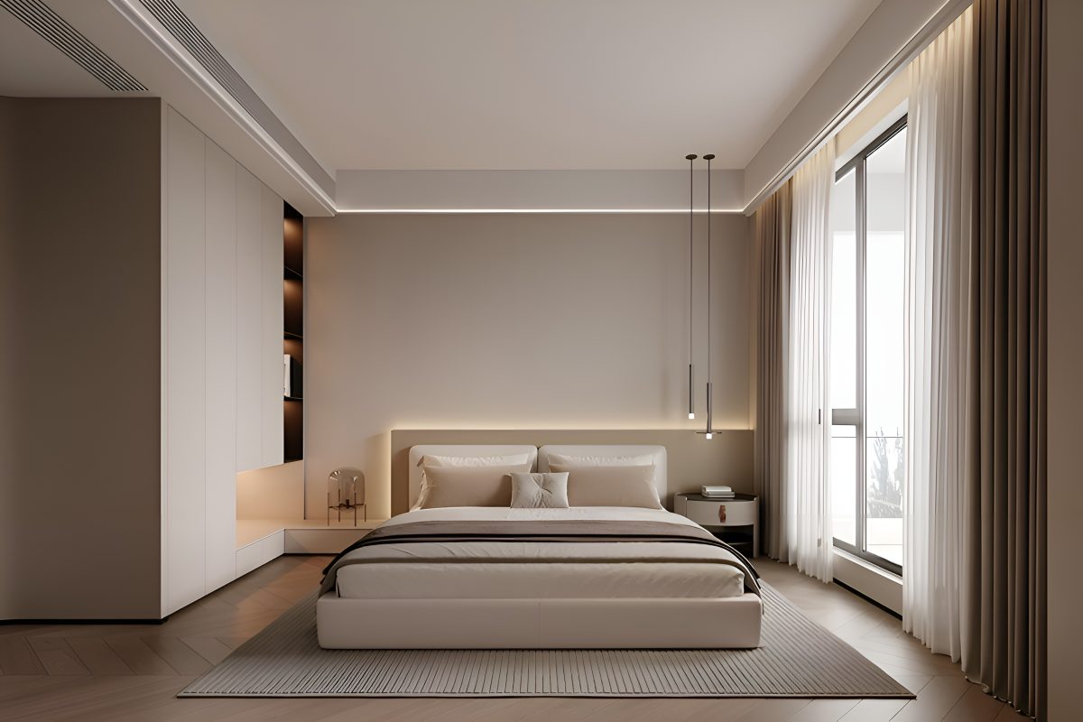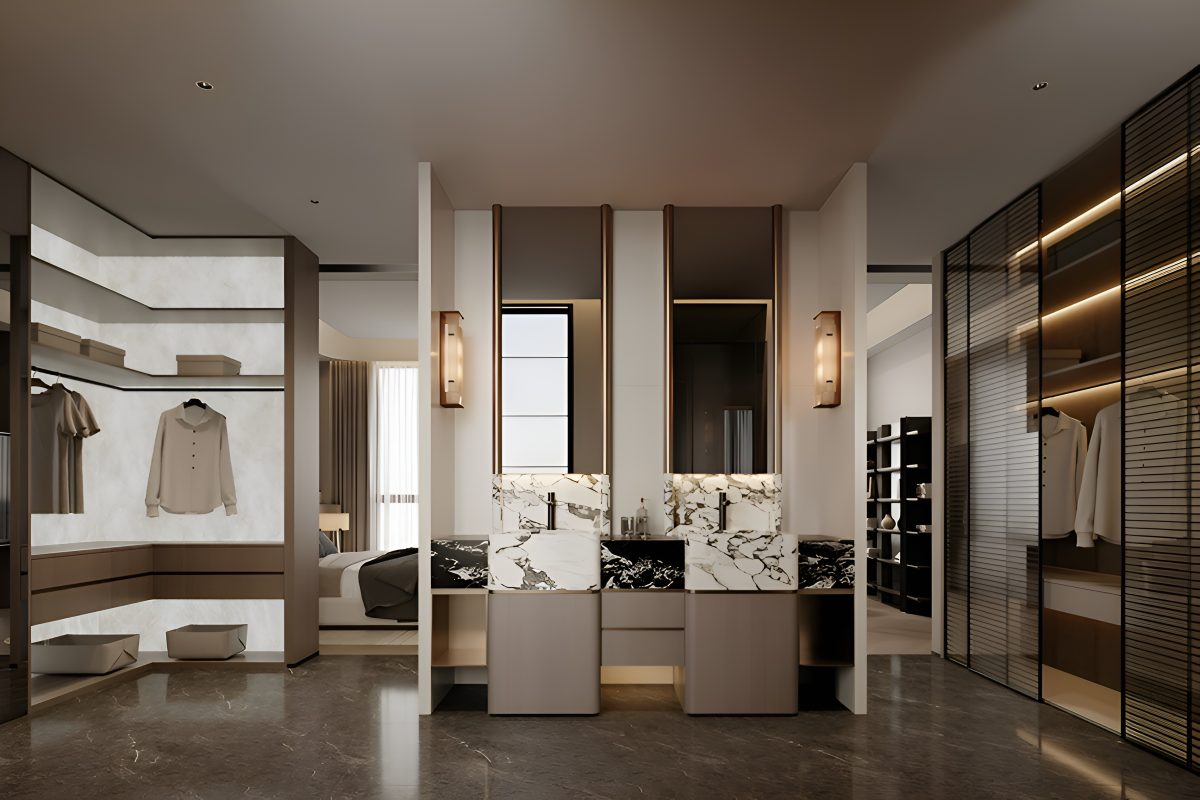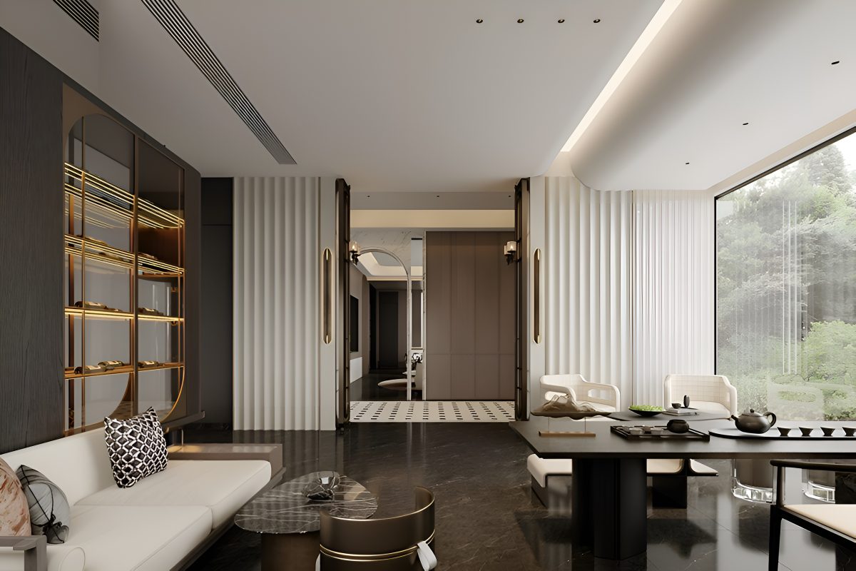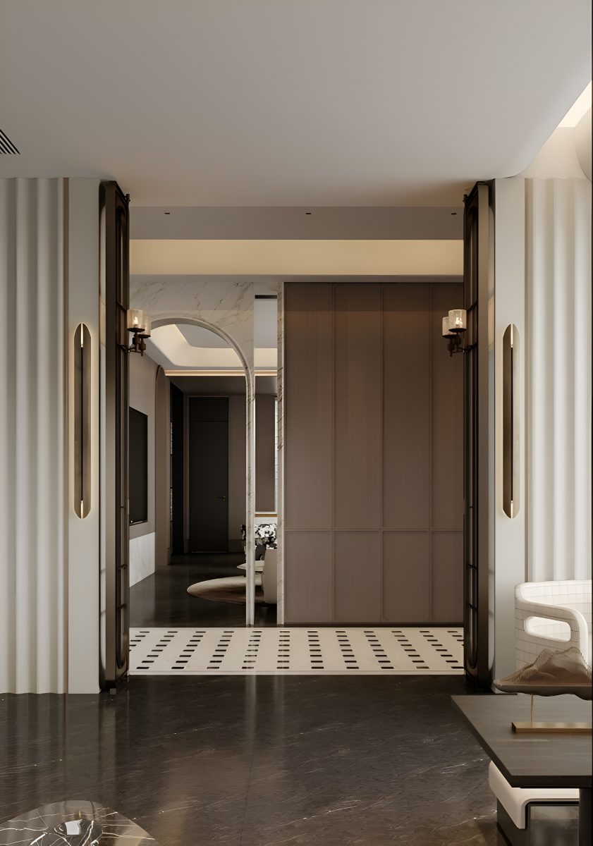 Интерьер построен на гармонии минимализма и комфорта. В основе концепции — натуральные материалы и мягкая палитра оттенков, подчёркнутые акцентами из камня и тёмного дерева. Большие панорамные окна усиливают ощущение простора и наполняют помещения естественным светом.